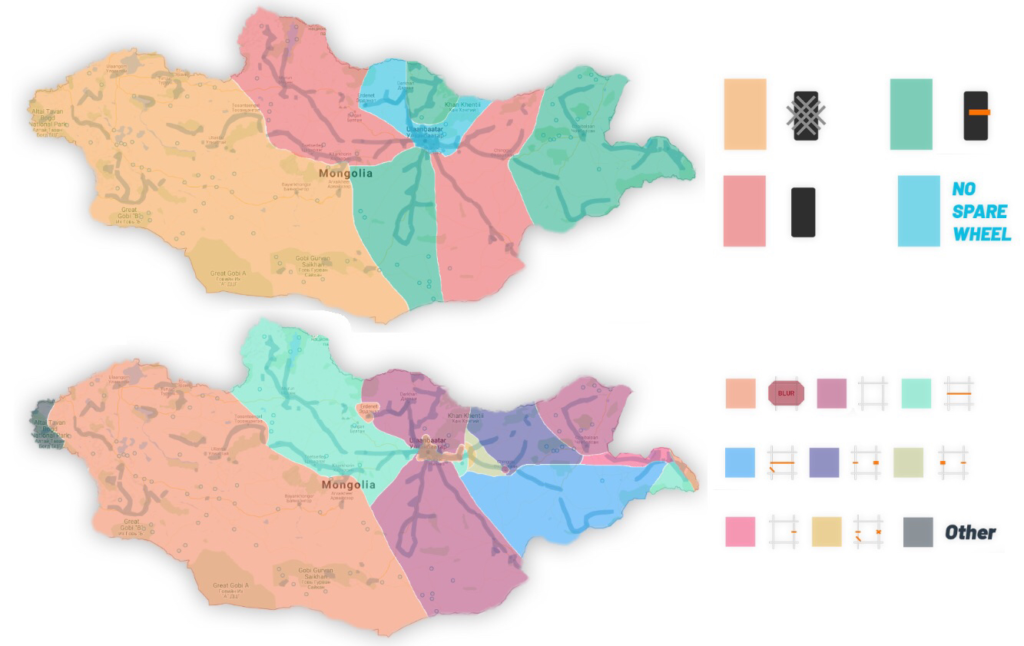 ・「タイヤの見え方」とGoogleカーのルーフレール真ん中にある「オレンジ紐の見え方」である程度の地域判別が可能。※下画像クリックで拡大
