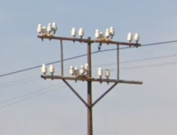 電柱の上に白い鳩のようなものがたくさんついている。